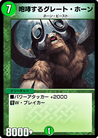 「グレート・ホーン」は、7コストクリーチャーとしてのパワーは高いものの、スピードアタッカーなどの即効性のある効果を持たず、確定除去に弱い。同コストのクリーチャーとしては、環境デッキで使われている「二角の超人」が存在する。