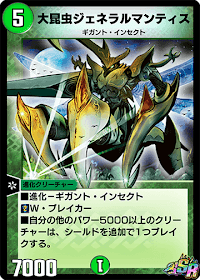 ジェネラルマンティスは自分以外のパワー5000以上のクリーチャーのシールドの破壊枚数を1枚追加させる効果を持っている。必要マナは5と速攻デッキにしては重めなので、ミッドレンジ寄りのデッキで倒しきるターンに出して使うのがおすすめ。