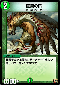 「巨翼の爪」は、相手の水/闇のクリーチャー数に応じてパワーが上がるクリーチャーだ。非常に対戦環境に左右されやすい効果をしており、相手のクリーチャー数を減らしてしまうと、パワーが下がってしまうデメリットにもなり得る。