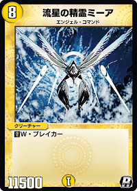 「ミーア」はパワー11500と強力なパワーを誇るクリーチャーだが、Wブレイカー以外の効果を持たないバニラクリーチャーだ。マナコストが8と重く、確定除去で対処されやすいデメリットを持つため活躍の場は少ない。