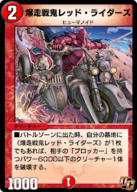 | ■バトルゾーンに出た時、自分の墓地に《爆走戦鬼レッド・ライダーズ》が1枚でもあれば、相手の「ブロッカー」を持つパワー6000以下のクリーチャー1体を破壊する。 |