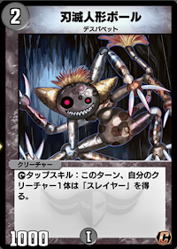 タップスキルで味方のクリーチャーにスレイヤーを付与できる。火文明の「ピーカブのドライバー」と比べると、自身以外にクリーチャーが必要な上、付与したクリーチャーはおそらく破壊される点から非常に扱いづらい。