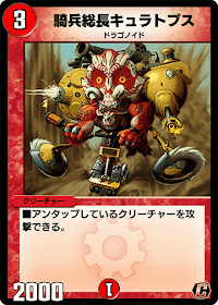 3コスト2000でアンタップ中のクリーチャーを攻撃可能。速攻デッキの小型クリーチャーに対して強く、「肉弾兵ウルティモ」などを採用したドラゴノイドデッキで採用される可能性がある。