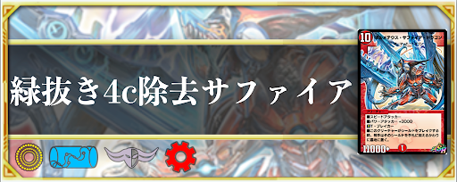 デュエプレ/デュエマプレイスの緑抜き4c除去サファイアデッキのレシピと回し方、デッキコードを紹介。キーカードとなるカードの紹介やデッキの特徴、序盤〜終盤までのデッキの回し方について紹介しているため、ぜひ参考にどうぞ。