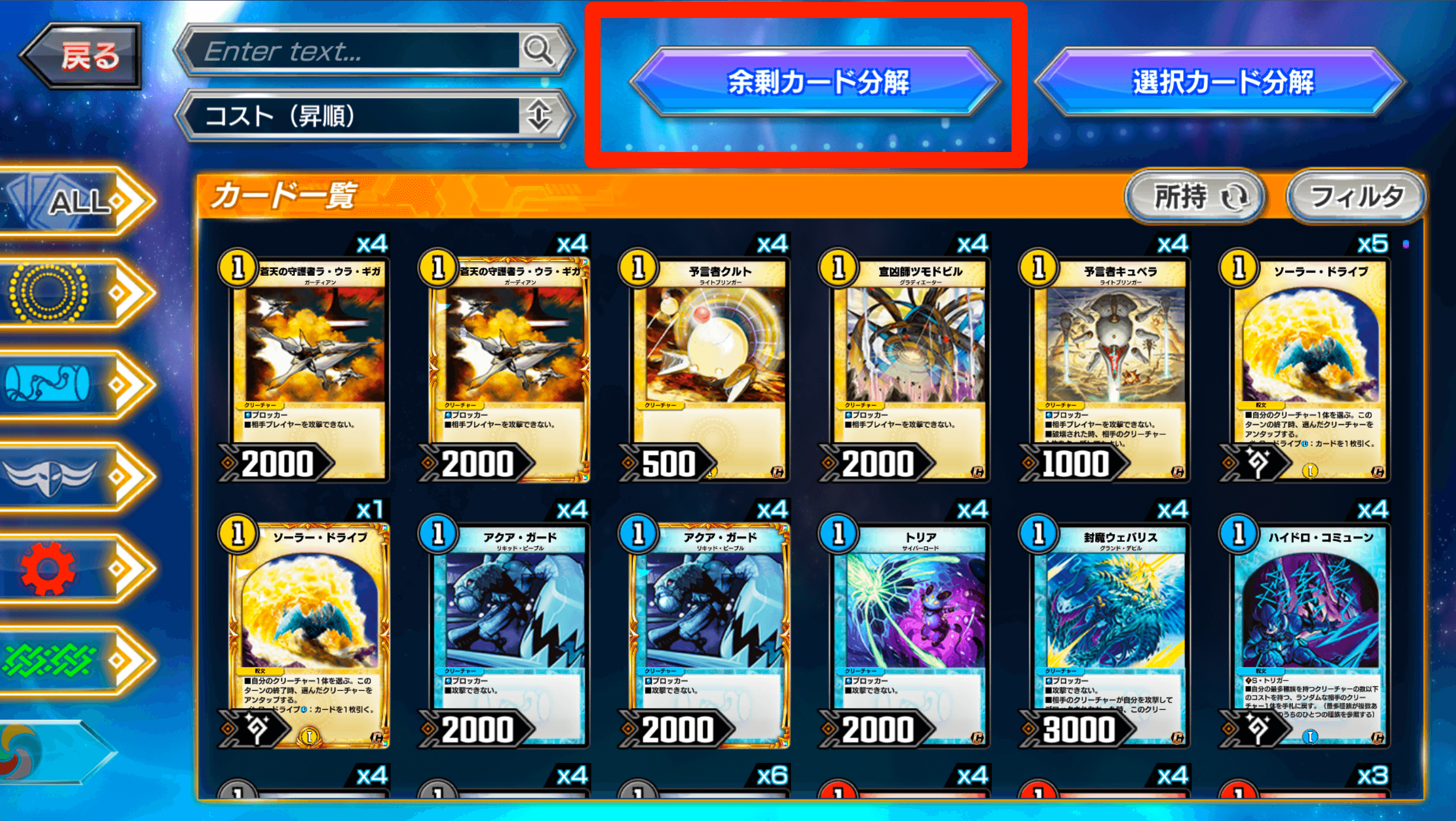 同種の4枚以上所持しているカードがある場合は、カード一覧の「余剰カード分解」を利用して一気に分解しよう。デッキに詰め込める同種カードの最大枚数は4枚のため、5枚目以降の同種カードを持っている意味は無い。「余剰カード分解」機能を積極的に活用して、カードを分解する手間を省いていこう。
