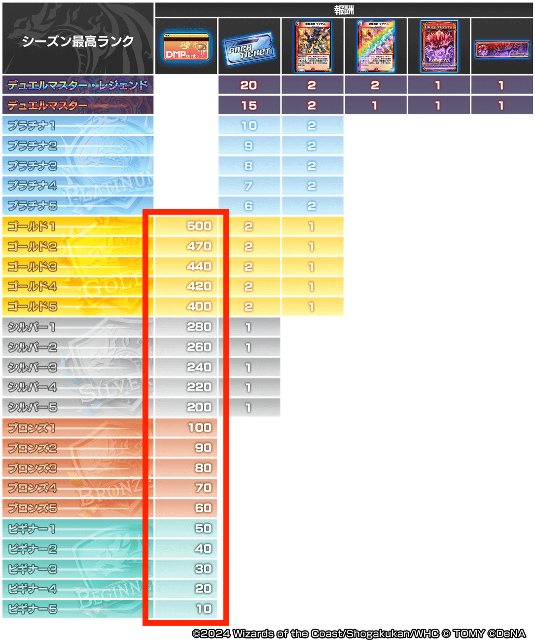 DMポイントを貯めるには、ランクマッチ報酬も欠かせない。ランクマッチ報酬は、ランクマッチシーズン期間中に到達できた最大ランクに応じて、シーズン終了時に受け取れるシステムになっている。ランクが上がるほど配布されるパック報酬などが増えるため、できるだけ高ランクを目指そう。