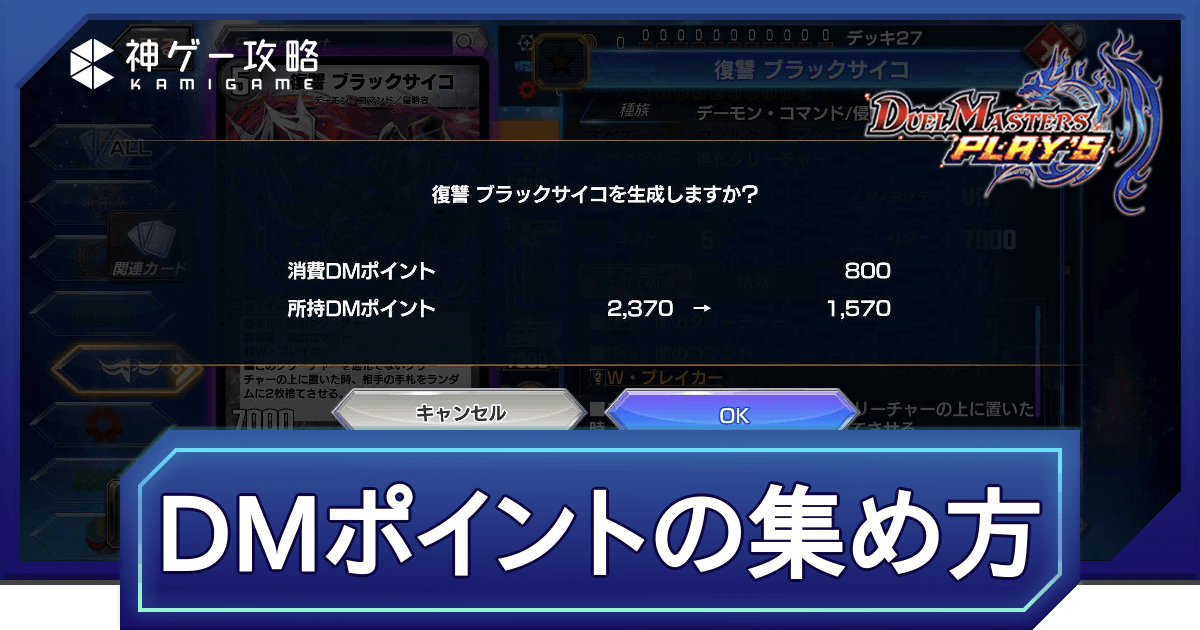 『デュエプレ(デュエマプレイス)』のDMポイントの使い道と効率的に集める方法を掲載。カード生成に必要なDMポイントの貯め方、カードをプレミアム化するチケットの交換についても掲載しているため、DMポイントが貯まらない方、使い方に迷っている方はぜひご参考にどうぞ。