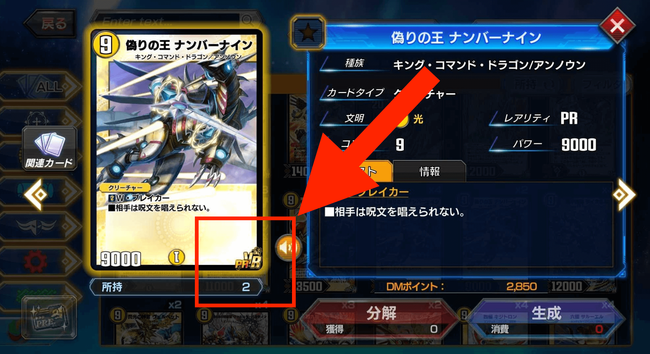DMポイントは原則、カードを分解した時に入手でき、レアリティの高いカードほど分解した時にもらえるDMポイントが高い。ただし、カードの生成に必要なDMポイントに対して、分解で入手できるDMポイントは少ないため、生成対象は慎重に選ぼう。