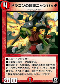 「ニャンパッタ」はパワーが2000と低く毎ターン攻撃しなければならないデメリットも持つため生存能力は低いが、自分のターン開始時、ドラゴンのコストを踏み倒して召喚する放置すると厄介な効果を持っているため、相手に除去を委ねるヘイト操作に優れたカードだ。