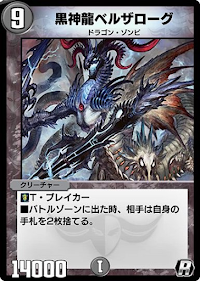 「黒神龍ベルザローグ」は、召喚時相手の手札を2枚ハンデスできる「クエイクス」と似た性能を持つドラゴン・ゾンビだ。「クエイクス」とは違い、ハンデス対象は相手の選択に委ねられる他、コストが非常に重い。ただし、安定した枚数のハンデスが可能である点と、ドラゴンサポートを受けられるメリットの違いもある。