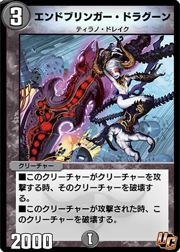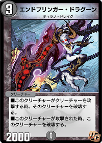 「エンドブリンガー・ドラグーン」自身が攻撃対象になってしまうと非常に脆いため、相手の殴り返しには非常に弱い。相手の殴り返せるクリーチャーが居ない状況で攻めていこう。
