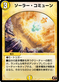 『デュエプレ(デュエマプレイス)』の「ソーラー・コミューン」の評価と採用デッキについて紹介。カードの効果や特徴、生成・分解コスト、関連カードなども掲載しているため、カード生成の参考にどうぞ。