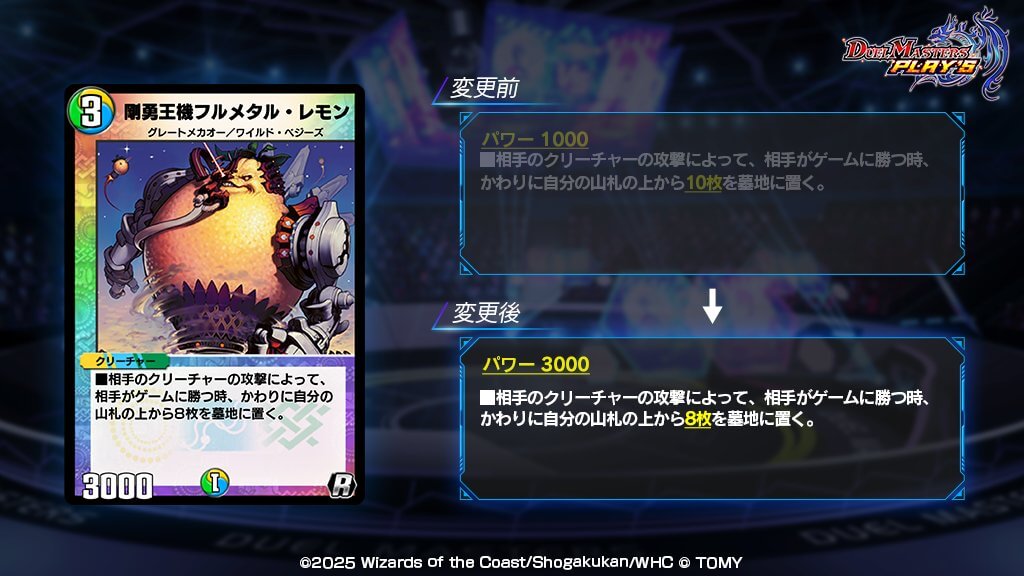 下方修正によって墓地に送る枚数が7枚から10枚に、パワーは3000から1000に修正。