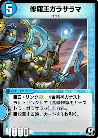 金剛修羅王【種族】- 【コスト】- 【パワー】- 【カードタイプ】ゴッド 【効果】 ■ゴッド:次のいずれかのゴッド・クリーチャーとして召喚する。 ▶︎④<<金剛神ガナストラ>> ▶︎⑤<<修羅王ガラサラマ>> |