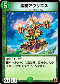 | ■S・トリガー ■バトルゾーンに出た時、自分の山札の上から1枚目をマナゾーンに置く。 |
