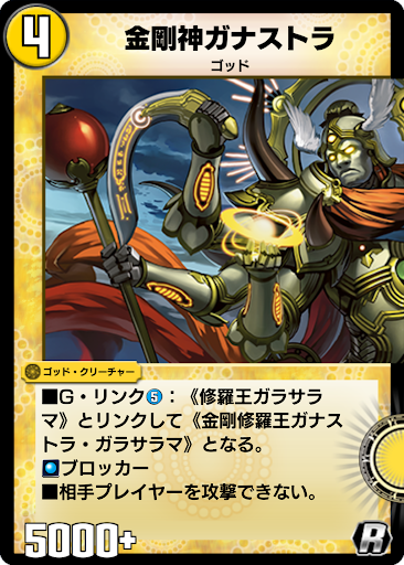 修羅王ガラサラマ【種族】ゴッド 【コスト】5 【パワー】4000+ 【カードタイプ】ゴッド・クリーチャー 【効果】 ■G・リンク:《金剛神ガナストラ》とリンクして《金剛修羅王ガナストラ・ガナサラマ》となる。 ■攻撃する時、カードを1枚引く。 |