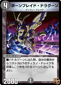 | ■バトルゾーンに出た時、自分の墓地からコスト3以下のティラノ・ドレイクを探索し、1枚をバトルゾーンに出してもよい。 |