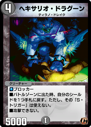 | ◇ブロッカー ■バトルゾーンに出た時、自分のシールドを1つ手札に戻す。ただし、その「S・トリガー」は使えない。 ■攻撃できない。 |