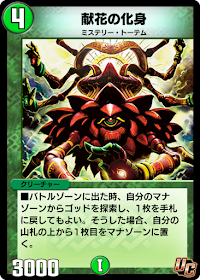 | ■バトルゾーンに出た時、自分のマナゾーンからゴッドを探索し、1枚を手札に戻してもよい。そうした場合、自分の山札の上から1枚目をマナゾーンに置く。 |