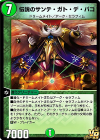 「伝説のサンテ・ガト・デ・パコ」は手札が5枚以下の場合に味方のドリームメイトかアークセラフィムが場に出るたびにドローできる進化クリーチャーだ。コストが7と重いため、マナ加速や「フェアリー・ギフト」で早期着地が不可欠。