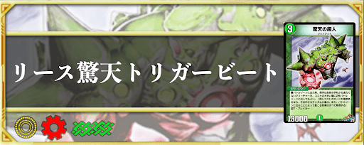 『デュエプレ(デュエマプレイス)』のNew Divisionにおけるリース驚天トリガービートデッキのレシピと回し方を紹介。キーカードとなるカードの紹介やデッキの特徴、序盤〜終盤までのデッキの回し方、デッキコードについて紹介しているため、ぜひ参考にどうぞ。