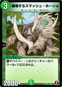 「威嚇するスマッシュ・ホーンα」はバトルゾーンにいる味方のサバイバーのパワーを+1000するクリーチャーだ。「バースト・ショット」や「炎槍と水剣の裁」のようなパワー参照の全体除去を回避できるため、クリーチャーを並べる際に活躍する。