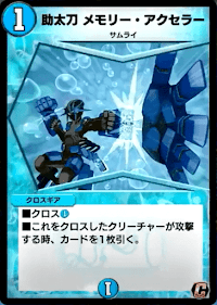 「助太刀メモリー・アクセラー」はクロスしたクリーチャーが攻撃するたびに1枚ドローするクロスギアだ。早い段階で低コストクリーチャーにクロスすることで後続のリソース確保に一役買う。