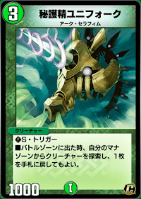 《秘護精ユニフォーク》は、登場時にマナからクリーチャーを回収できるため、後半に大型獣の回収と言ったプレイングを可能にできるトリガー獣だ。競合相手として《ピクシー・コクーン》が存在しており、《ピクシー・コクーン》の方がマナの軽さと消費されるマナを補充できる分使い勝手が良い。