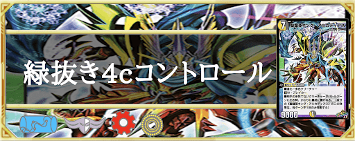 『デュエプレ(デュエマプレイス)』のAll Divisionにおける|緑抜き4cコントロールデッキのレシピと回し方を紹介。キーカードとなるカードの紹介やデッキの特徴、序盤〜終盤までのデッキの回し方、マスター・レジェンド到達デッキ、デッキコードについて紹介しているため、ぜひ参考にどうぞ。