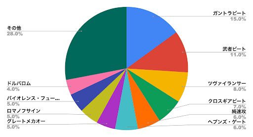 今週は、前週で「武者ドラゴン」や「ツヴァイランサー」などの単色ビートが流行った結果、「キング・アルカディアス」を軸としたロックデッキが流行している。また、「ツヴァイランサー」などのビートに対して優勢を示していたデッキが減少した結果、「ガントラビート」が再び環境の中心に食い込んでいる状況だ。