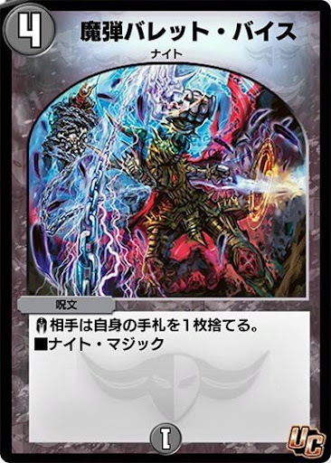 「魔弾バレット・バイス」は相手の手札を1枚捨てさせるナイトマジックだ。捨てる手札は相手が選択できるが、ナイトがバトルゾーンにいれば4マナで2枚捨てさせられるため使い勝手がいい。4マナであるため3マナナイトの「フランツ1世」や「アヴァラルド公」などと合わせて使いやすい。