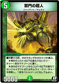 「禁門の超人」は、攻撃時に相手の低コストクリーチャーをマナに送るか自分のマナから低コストのサムライまたはジャイアントを場に出せるカードだ。登場時に効果を発動する「バルット」や「サイバゴン」と相性が良い。