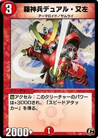 「羅神兵デュアル・又左」はクロスギアを装備されている状態だとスピードアタッカーが付与されるクリーチャーだ。性能のみで言えば強力だが、味方にスピードアタッカーを付与する「マッハアーマー」が強力すぎるため、採用されることが少ない。