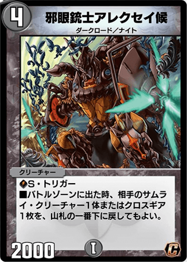 「邪眼銃士アレクセイ候」は相手のサムライかクロスギアを相手の山札の下に送るSトリガー獣だ。サムライとクロスギアに対してのみではあるが、非常に性能が高いためサムライとクロスギアが多く採用される環境で活躍する。