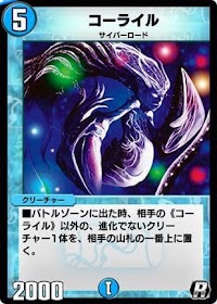 | ■バトルゾーンに出た時、相手の《コーライル》以外の、進化でないクリーチャー1体を、相手の山札の一番上に置く。 |
