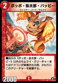 | 修正後効果 | 自分の《ポッポ・弥太郎・パッピー》以外のサムライ・クリーチャーまたはドラゴンが破壊される時、かわりにこのクリーチャーを破壊する。 |