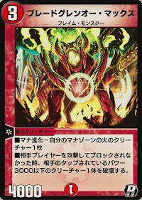 「ブレードグレンオー・マックス」は、攻撃時にタップ状態の敵を破壊する効果を持ったマナ進化獣だ。進化獣は召喚酔いしないため、攻撃して無防備になった相手クリーチャーに対しての奇襲性能が高い。