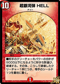 「超銀河弾 HELL」は、合計が9000以下になるように選んで破壊した分シールドを墓地に送れる高コストの破壊呪文だ。低いパワーのクリーチャーを並べる「メカオーデッキ」や「黒緑速攻」は、多くのクリーチャーを破壊できるためメタ要素となる。