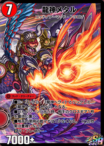 《龍神メタル》は、バトルゾーンに生存している限り相手の使用可能マナを減らす妨害工作が可能なクリーチャーだ。相手の行動を1ターン分遅らせるテンポアドバンテージが取れる。