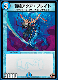 《蒼狼アクア・ブレイド》は、「リキッド・ピープル」「ナイト」「サムライ」3種との種族シナジーがある能力なしバニラクリーチャーだ。コストに対してパワーは一般的な数値で、比較的序盤から扱いやすい。