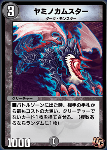《ヤミノカムスター》は、登場時に相手の手札にあるクリーチャー以外のカードを狙ってハンデスできるクリーチャーだ。「呪文」は勿論、「城」「クロスギア」「ゴッドカード」と言ったカードがハンデス対象になる。
