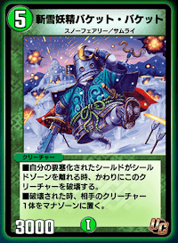 競合相手となる《天雷王機シルバー卿》は、パワーが低く除去されやすいため、除去された際もアドバンテージを稼ぐ際は、《斬雪妖精バケット・バケット》がマナ加速効果から優先される場合が多い。ただし、《天雷王機シルバー卿》の場合は、召喚コストが軽いため、防衛対象のシールドに応じて使い分けよう。