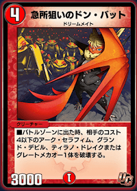 《急所狙いのドン・バット》は、登場時に特定種族の低コスト獣を破壊できるクリーチャーだ。破壊できる種族は、低コスト獣を並べつつ大型獣の召喚につなげる種族のデッキが多いため、序盤から盤面展開を妨害できる刺さりの良いカードである。