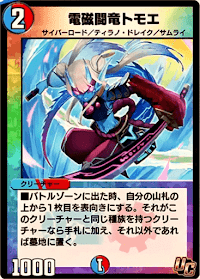 「電磁闘竜トモエ」は、3つの種族を所持しており、進化元としても優秀なクリーチャーである。同じ種族を持った進化クリーチャーの「エンペラー・マルコ」や「ボルガウルジャック」と組み合わせられるため、場に残った際は進化元として運用しよう。