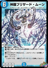 「神羅ブリザード・ムーン」は、攻撃時に手札が上限枚数になるまでドローできる究極進化クリーチャーだ。効果は任意のため、デッキアウトの恐れがある際は発動せず攻撃も可能である。