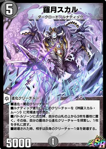 《神羅スカル・ムーン》SR ルナティック・エンペラーダークロード■究極進化-進化クリーチャー ■T・ブレイカー ■各ターン、初めて自分のクリーチャーが破壊される時、パワーが0より大きければ、かわりに相手のパワーが最も大きいクリーチャー1体を破壊する。(複数あるなら、ランダムに1体) (このカードは、《羅月スカル》として召喚してもよい) |