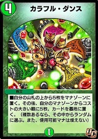 「カラフル・ダンス」は、山札から5枚をマナに送った後、マナゾーンにあるカードのコストが大きい順に墓地へ送る呪文だ。墓地にあるクリーチャーを召喚時大量に必要とする「大邪眼B・ロマノフ」と相性が良い。