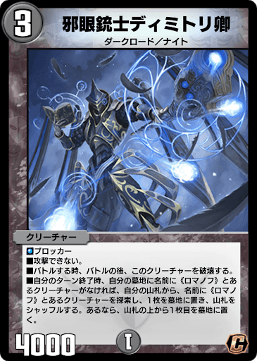 《邪眼銃士ディミトリ卿》は、デッキから《ロマノフ》クリーチャーを確定で墓地へ落として、蘇生コンボを狙う際の起点になるカードだ。《大邪眼B・ロマノフ》や《邪眼皇ロマノフI世》などの切り札を墓地へ落として、《魔光蟲ヴィルジニア卿》《インフェルノ・サイン》による蘇生を狙おう。