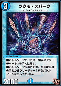 《ツクモ・スパーク》は、登場時に相手のクリーチャーのバウンスを行う小型獣だ。序盤からコスト軽減によるサポートを行う《コッコ・ルピア》や《西南の超人》と言った、カードのバウンスにより動きを鈍らせられる。