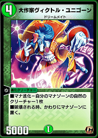 《大作家ヴィクトル・ユニゴーン》は、自然のクリーチャーであれば進化元にできるマナ進化獣だ。破壊された際に、マナゾーンへ送られる効果を持つため、序盤から攻撃を仕掛けよう。